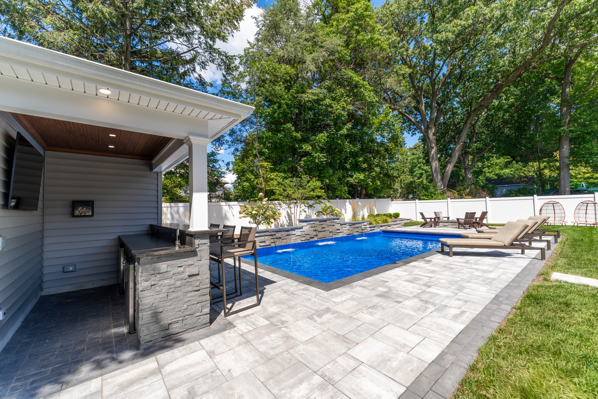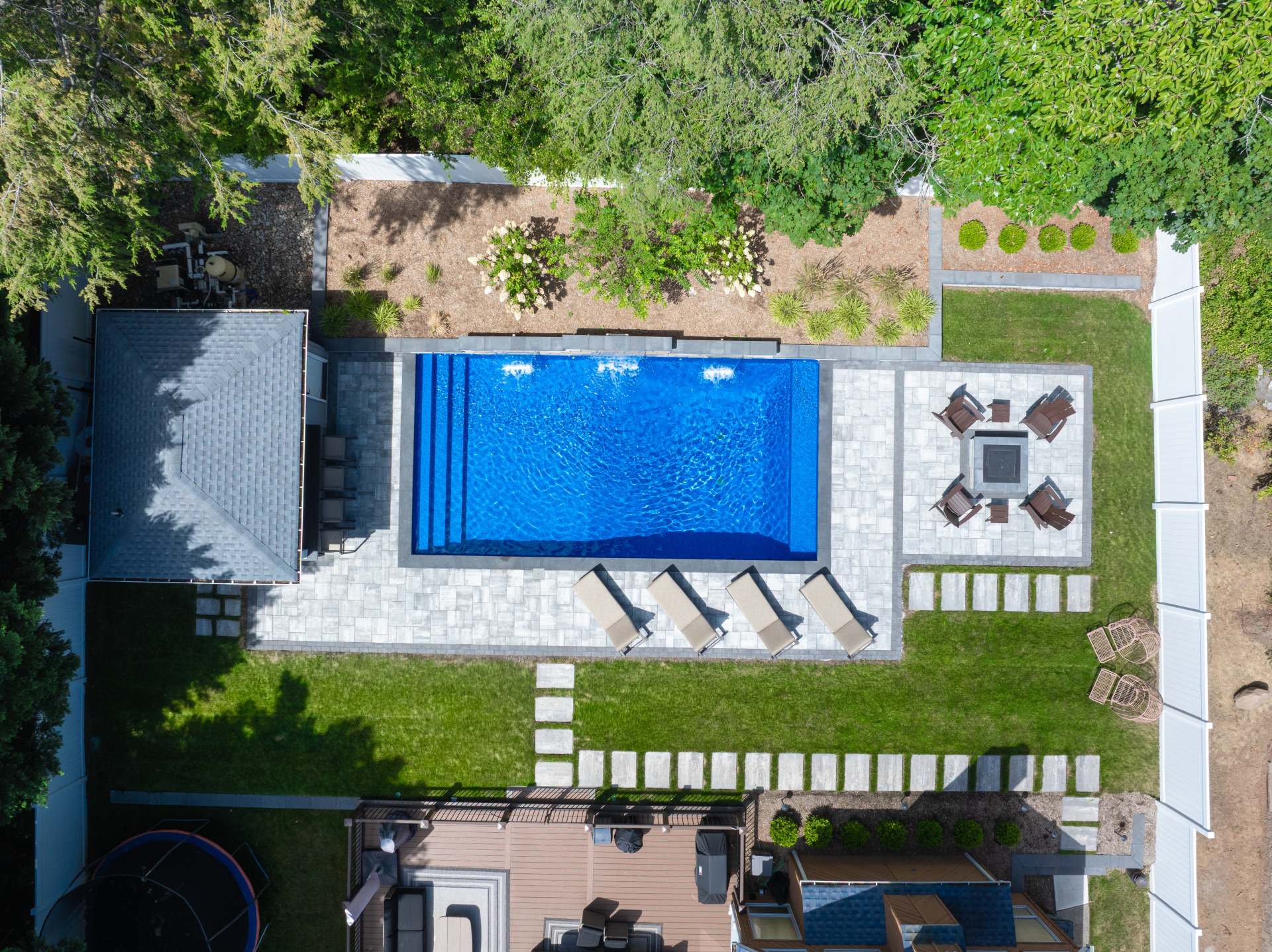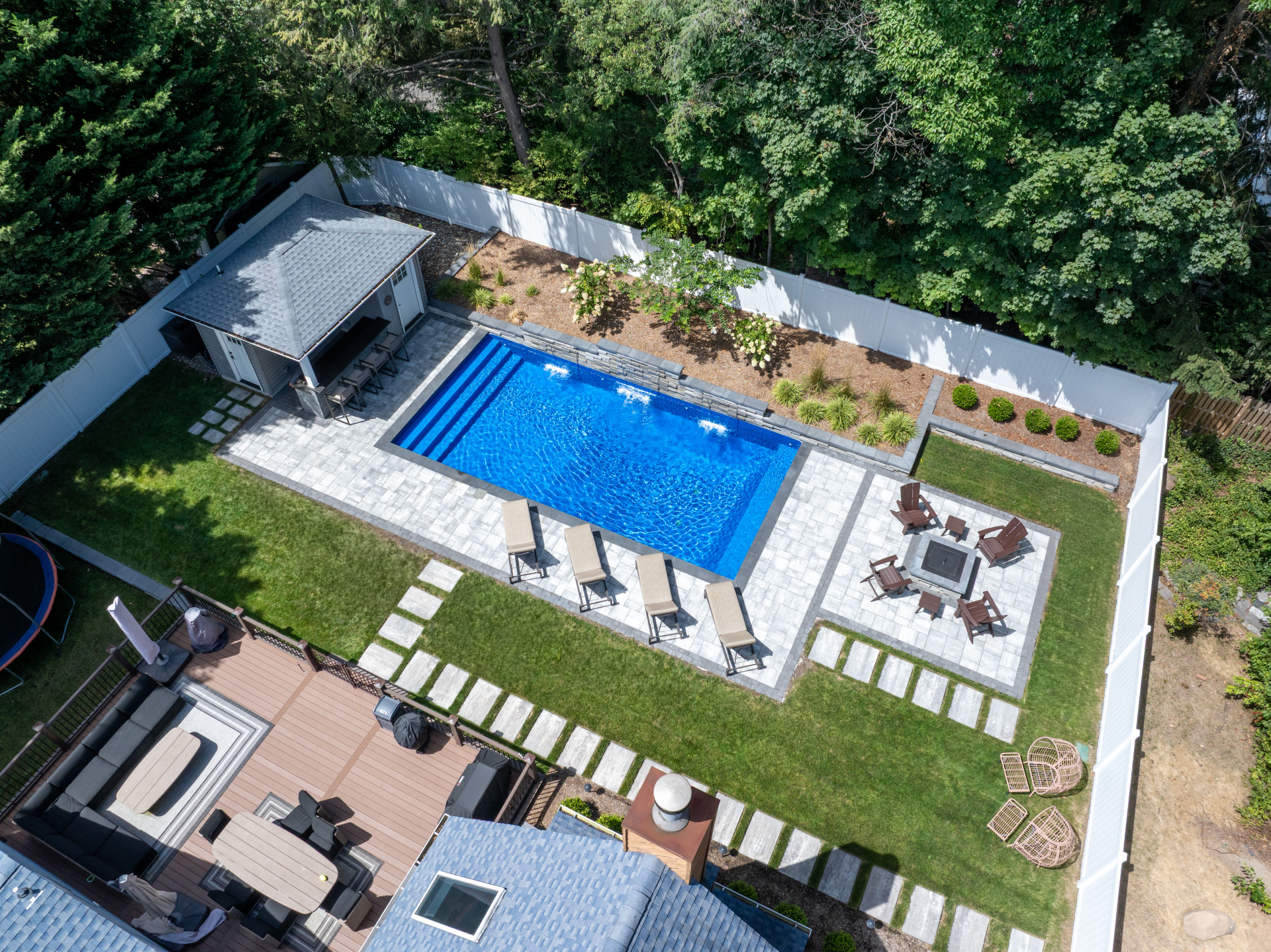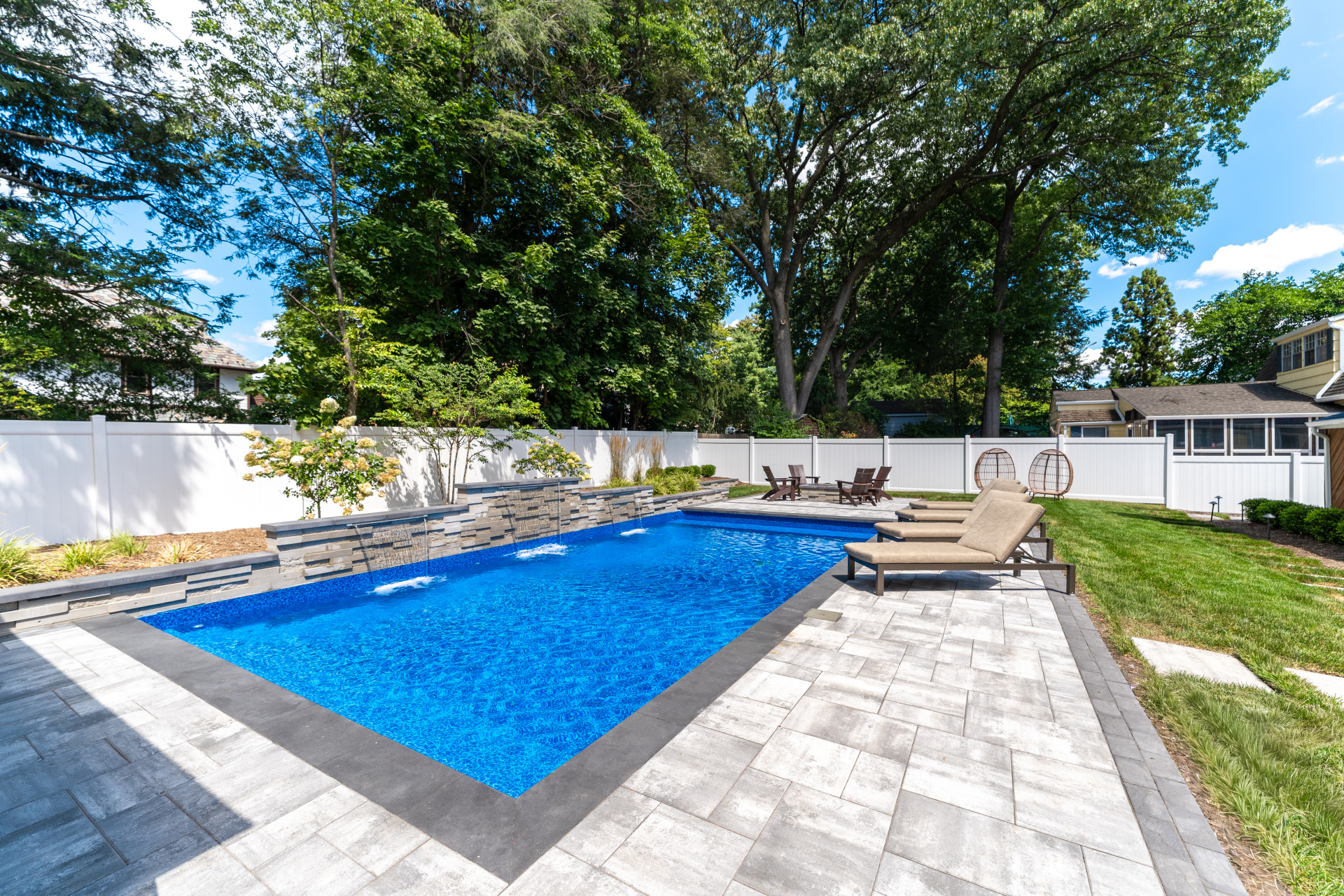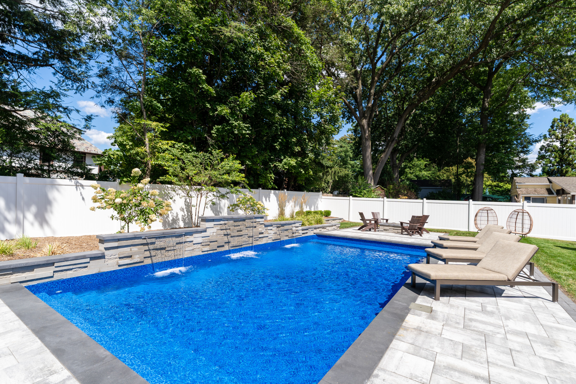 Type: Vinyl LinerSize: 16′ x 32′Liner: Kayden Manufacturing, “Indigo Reef, Full Floor”Coping: Cambridge Crusader Cap, “Coal”Patio: Cambridge, “Limestone Quarry Blend,” Smooth XL 3 Piece
