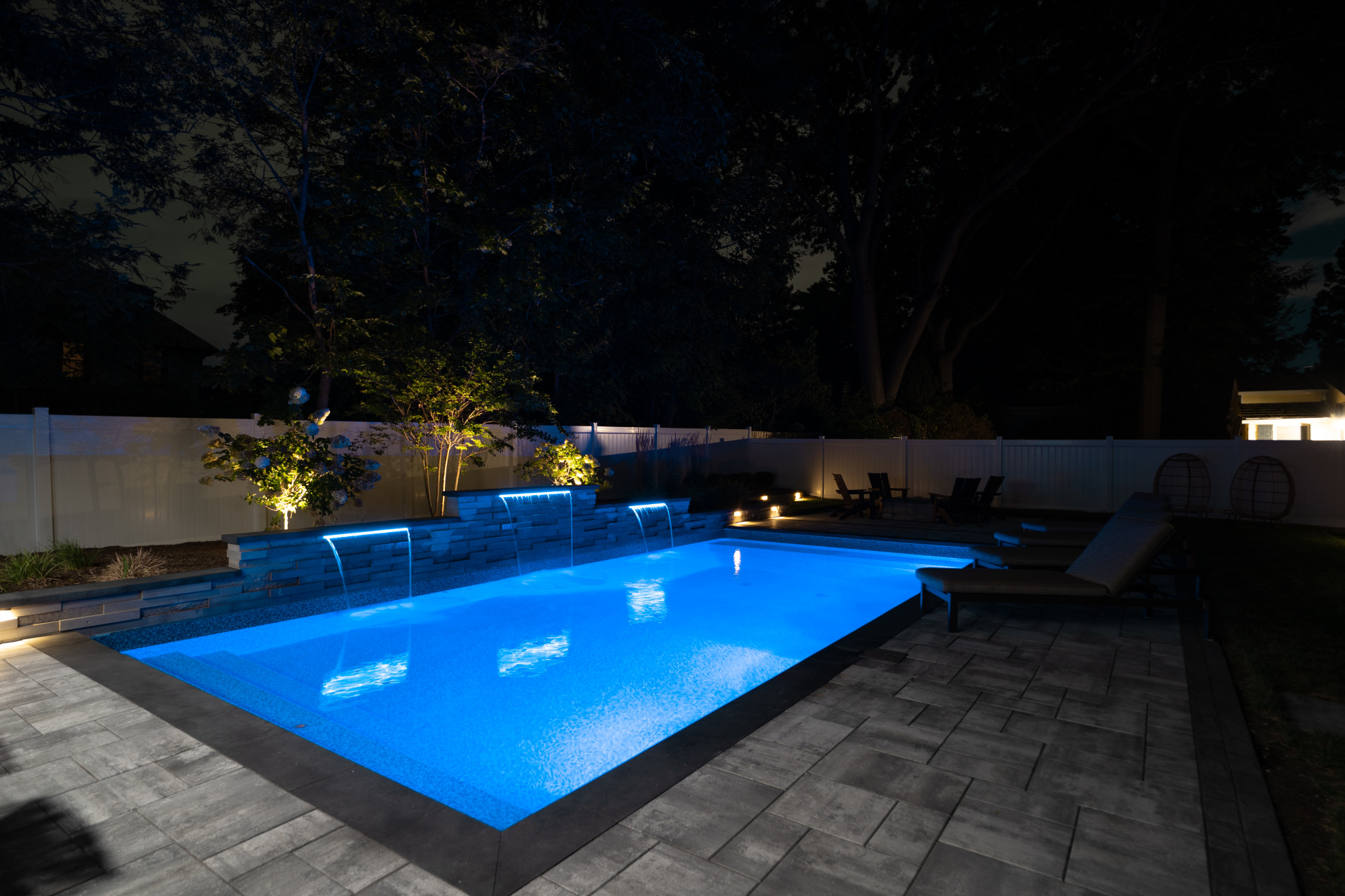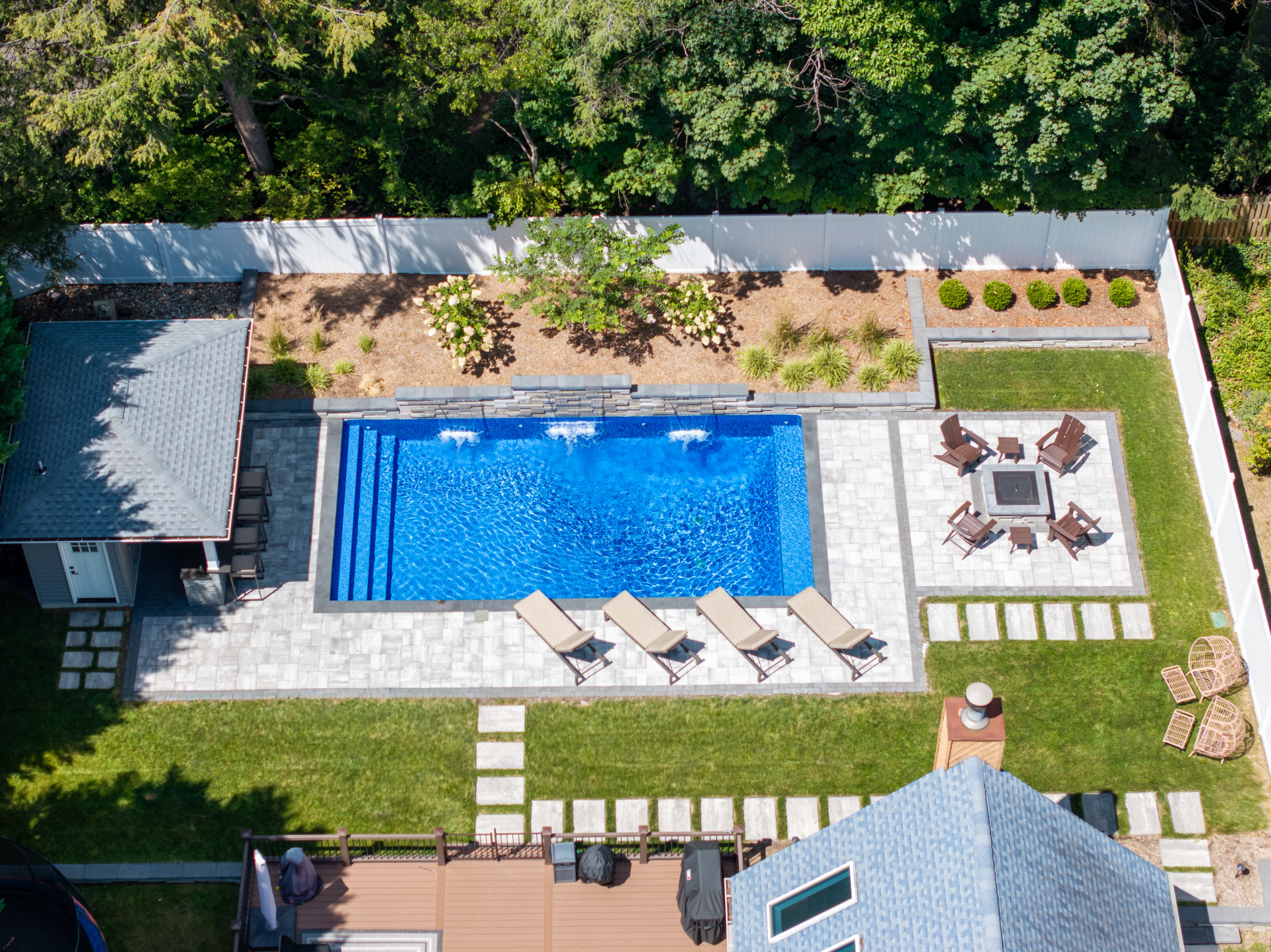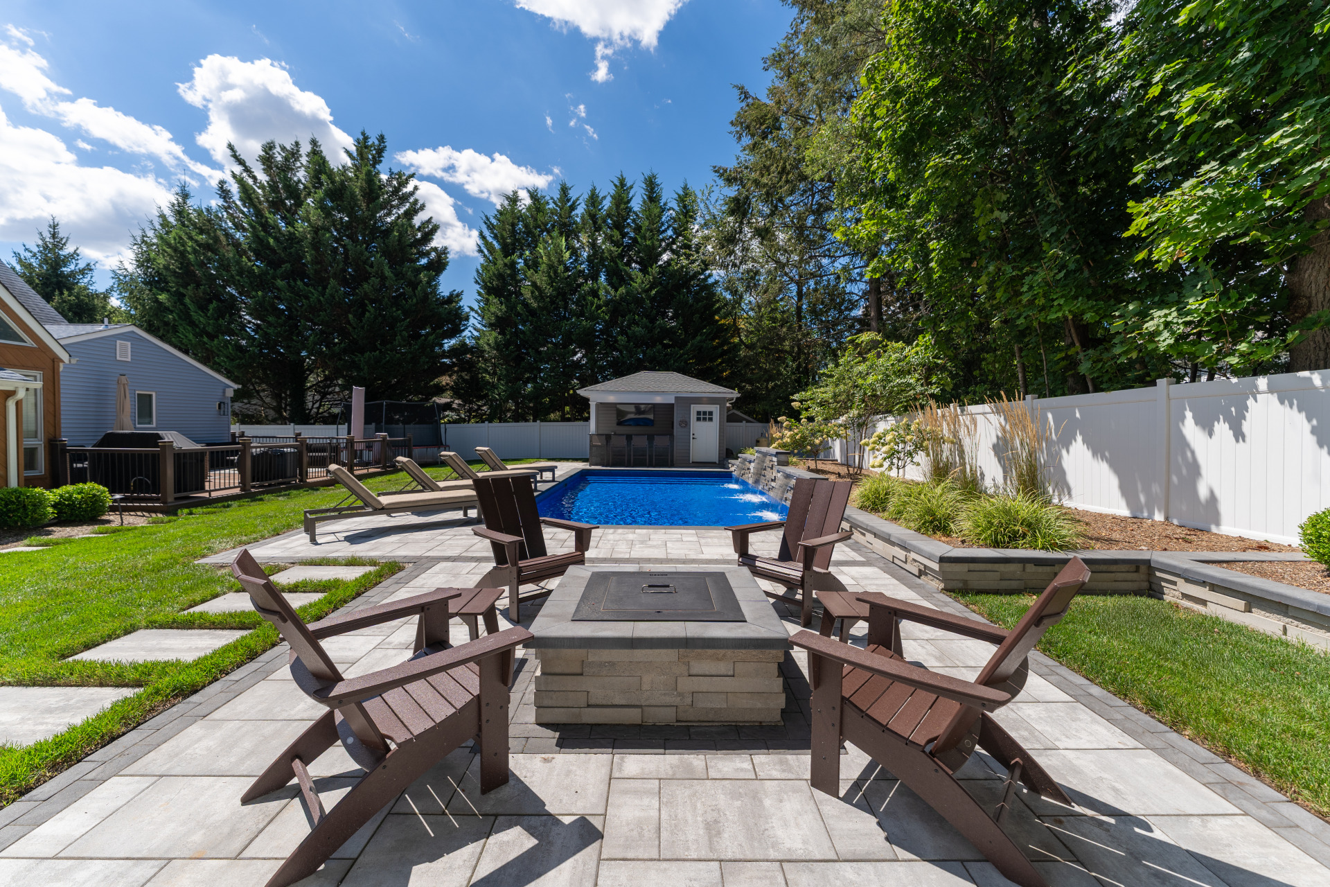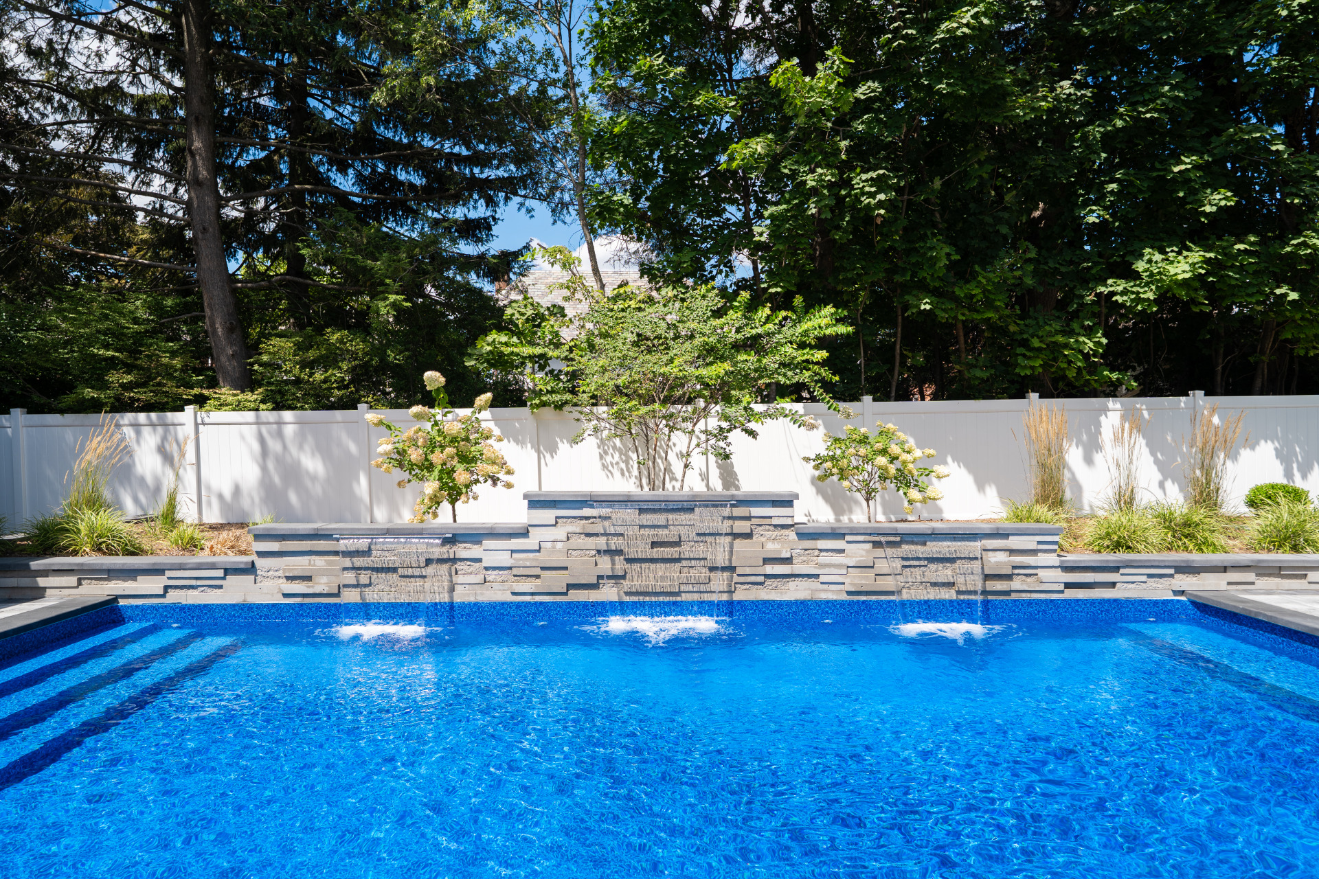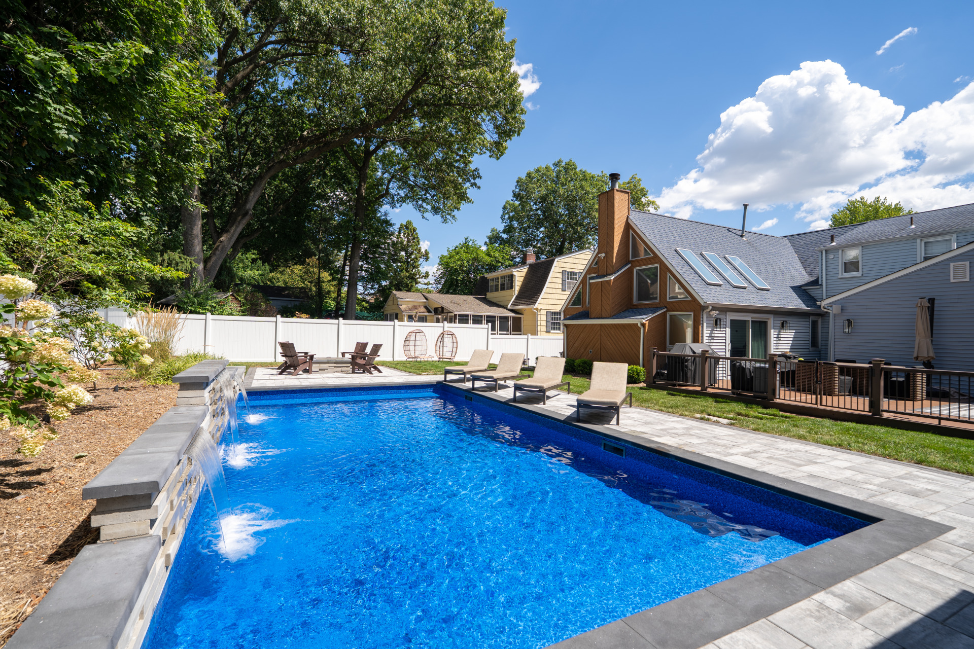 Type: Vinyl LinerSize: 16′ x 32′Liner: Kayden Manufacturing, “Indigo Reef, Full Floor”Coping: Cambridge Crusader Cap, “Coal”Patio: Cambridge, “Limestone Quarry Blend,” Smooth XL 3 Piece