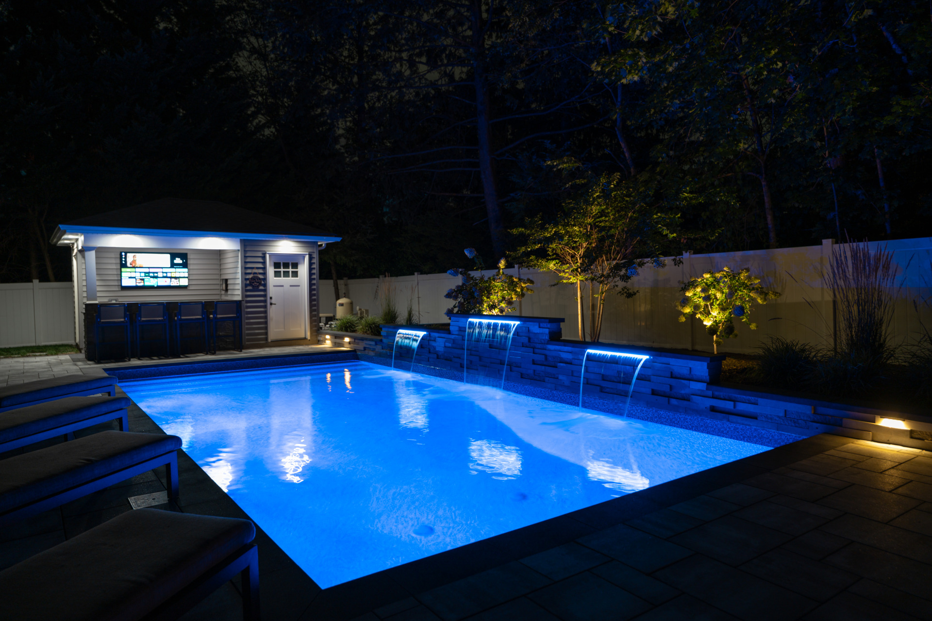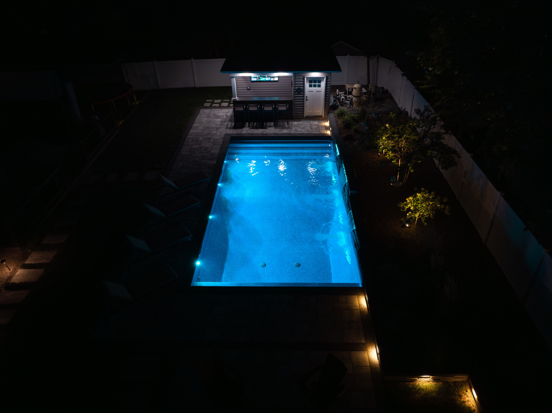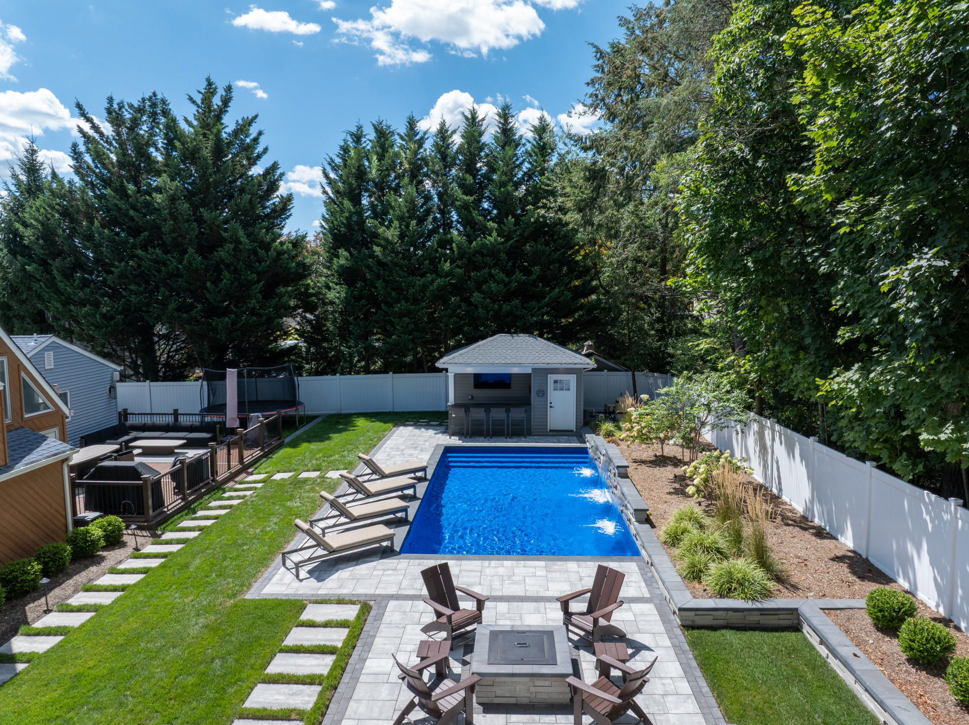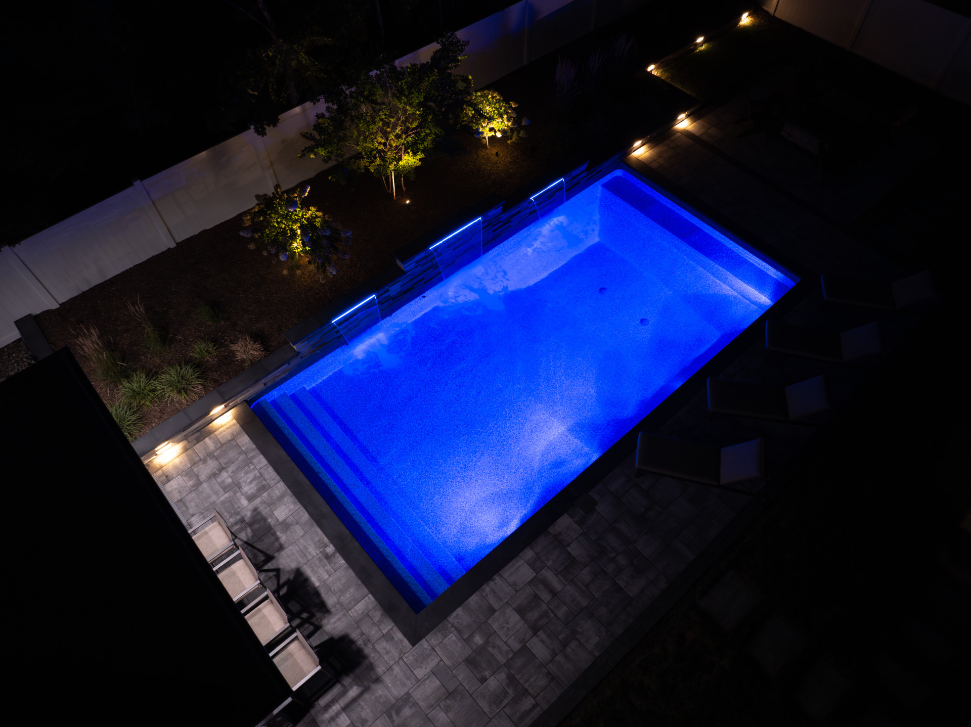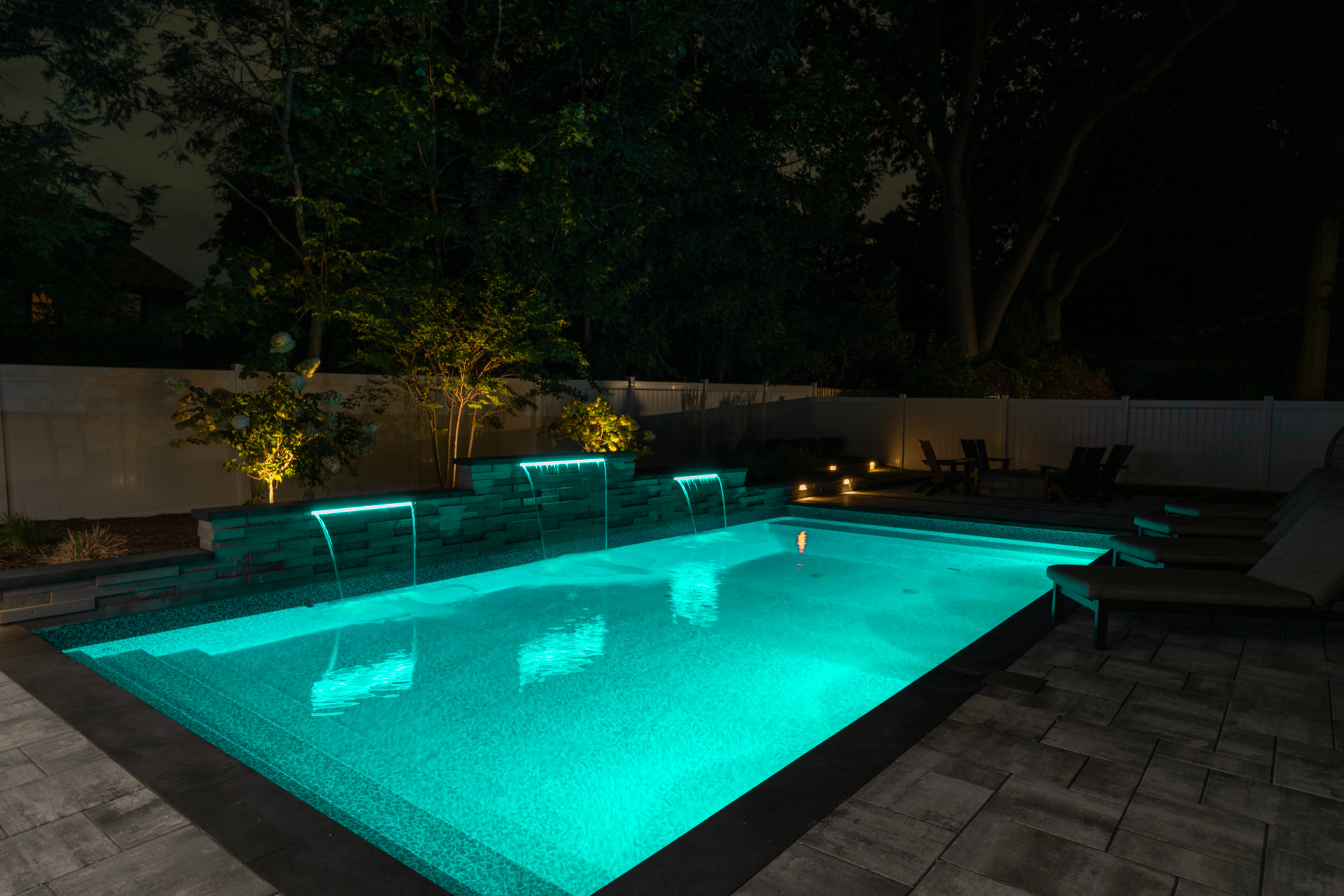 Type: Vinyl LinerSize: 16′ x 32′Liner: Kayden Manufacturing, “Indigo Reef, Full Floor”Coping: Cambridge Crusader Cap, “Coal”Patio: Cambridge, “Limestone Quarry Blend,” Smooth XL 3 Piece
