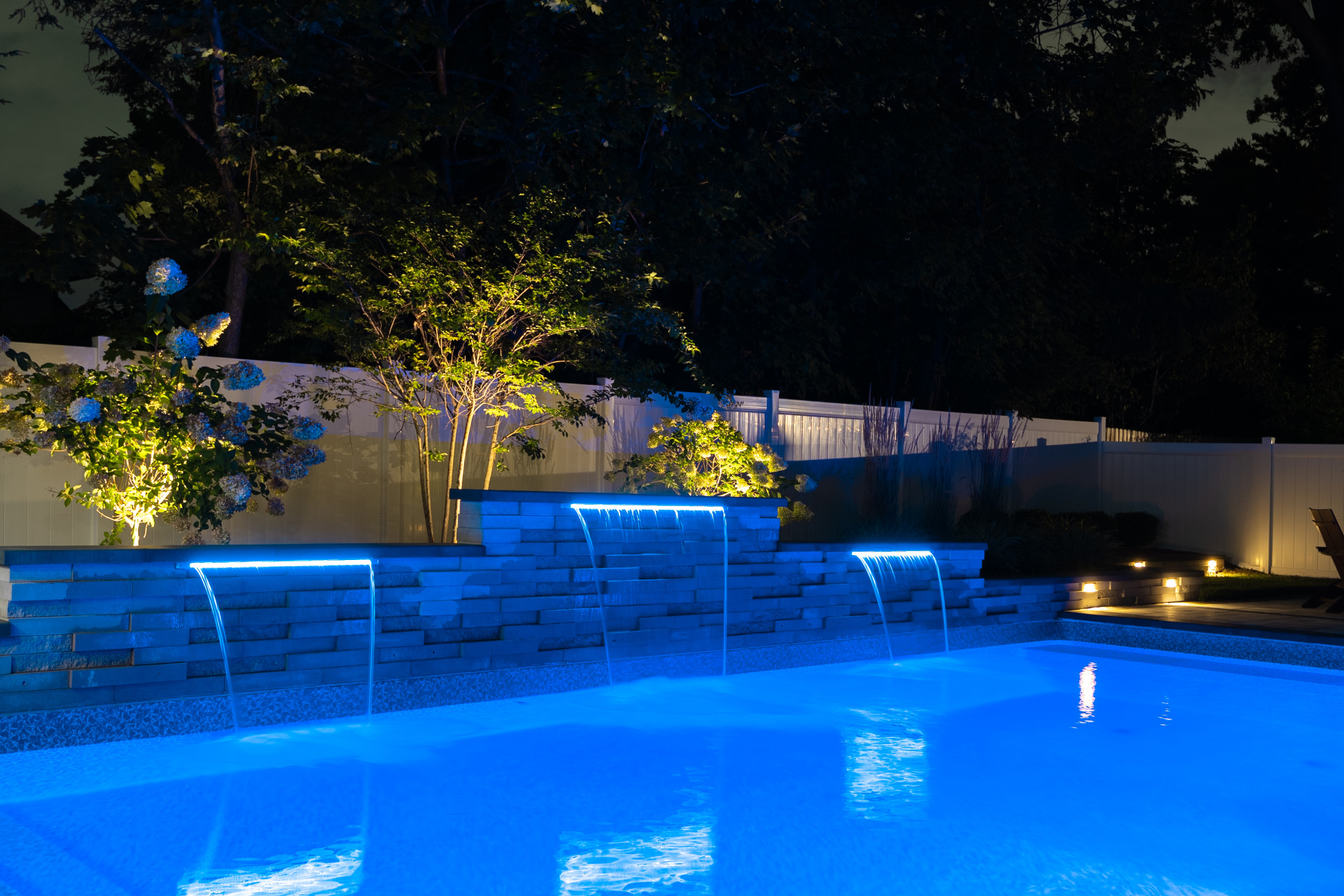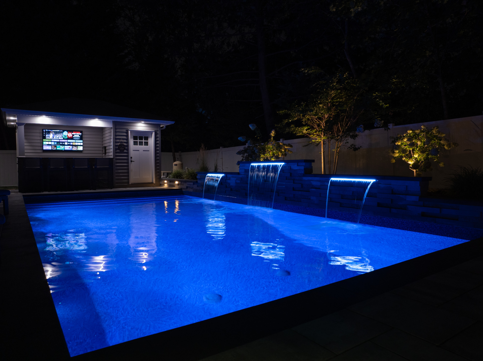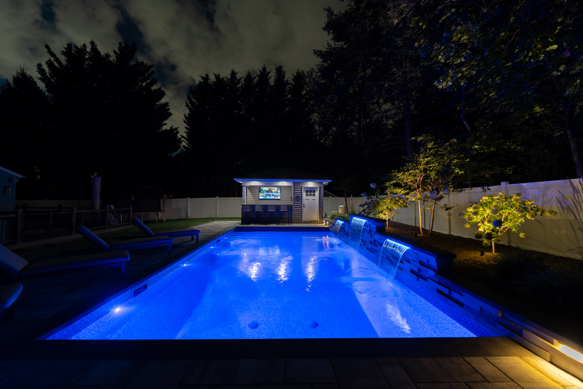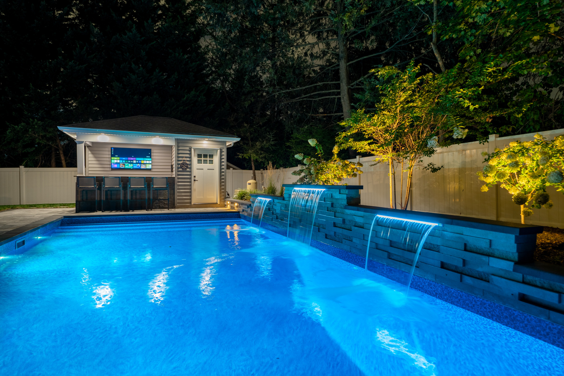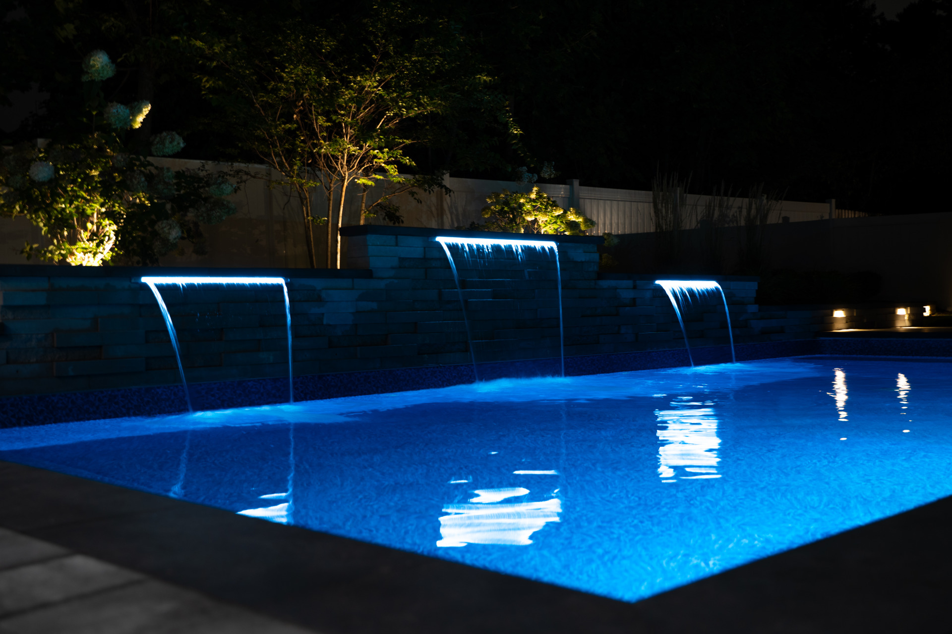 Type: Vinyl LinerSize: 16′ x 32′Liner: Kayden Manufacturing, “Indigo Reef, Full Floor”Coping: Cambridge Crusader Cap, “Coal”Patio: Cambridge, “Limestone Quarry Blend,” Smooth XL 3 Piece